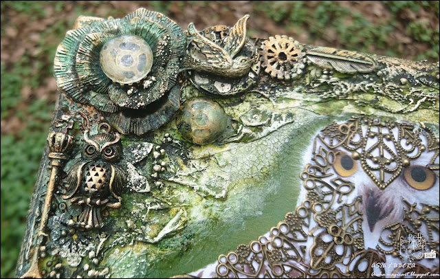 For my background I used lots of gazue , tissue papier and DecoArt crackle glaze to add more intereting texture. I cut into the pieces metal doily and decorating this beautiful owl. Then I glued all embellishments : flowers , birds ,spoon ,gears, bottle and many ,many others.I covered it with black gesso and painted over it with DecoArt acrylic paints and Distress spray stain. When everything dry I used fingers to add some highlights with Inka Gold.